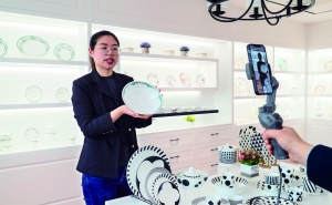 4月15日,江苏省淮安市洪泽区,淮安一家陶瓷企业的工作人员在展厅直播介绍产品。