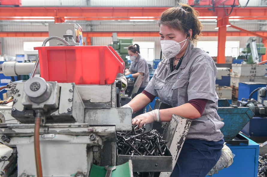 4月19日,在位于吉林市的富奥汽车零部件股份有限公司紧固件分公司车间,工人在生产车用零件。