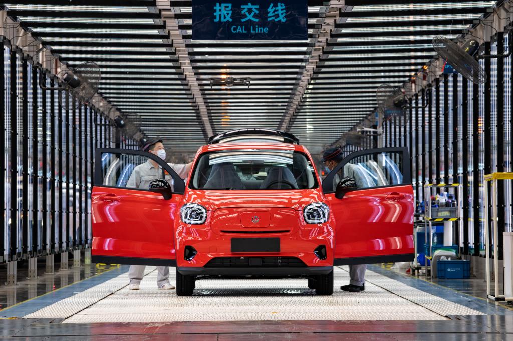 4月26日,在浙江省金华市新能源汽车小镇零跑汽车有限公司车间里,新能源汽车有序下线。 新华社发(胡肖飞 摄)
