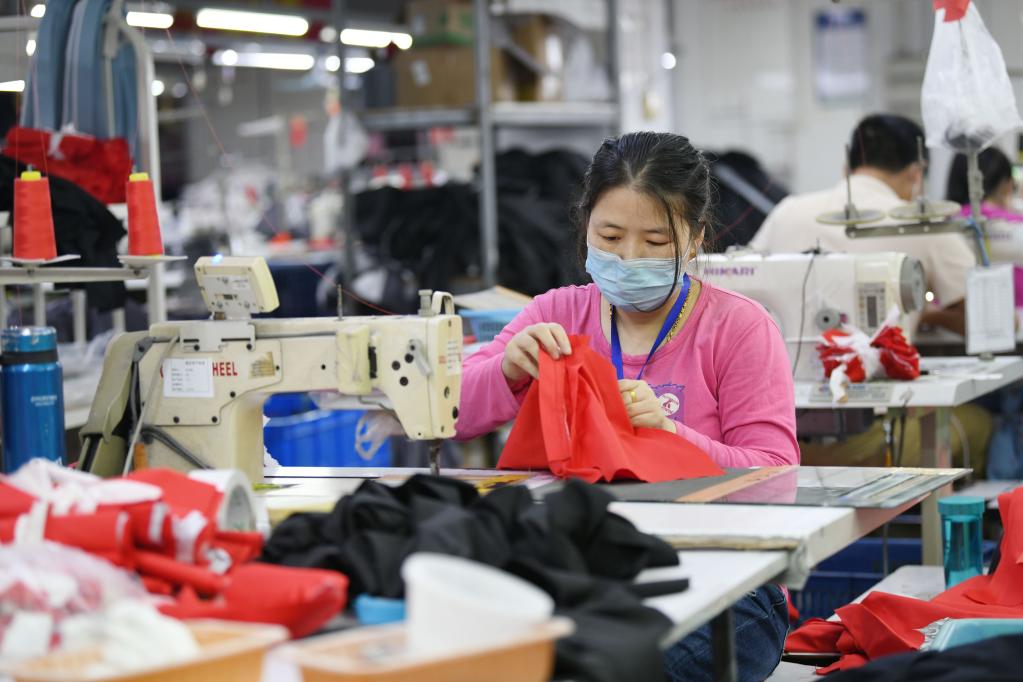 4月27日,在福建省福州市仓山区一家制衣企业,工人生产服装产品。近来,仓山区多措并举,减税降费减轻企业负担,助力民营工业企业高质量发展。 新华社发(王旺旺 摄)