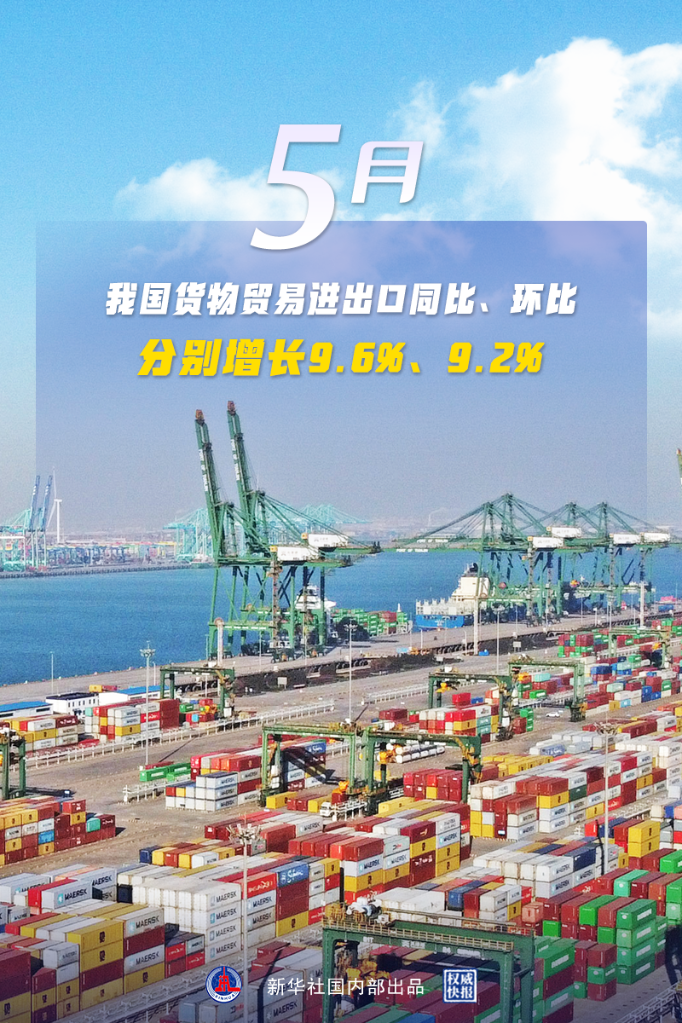 海关总署9日发布数据显示,2022年前5个月,我国货物贸易进出口总值16.04万亿元,同比增长8.3%。其中,5月当月进出口同比、环比分别增长9.6%、9.2%。海关总署统计分析司司长李魁文表示,随着一揽子稳经济政策措施落地见效,外贸物流进一步畅通,企业复工达产进一步提速,我国外贸有望继续保持稳定增长势头。(记者邹多为)