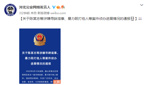 首页> 要闻>财经要闻 河北省公安厅:关于陈某志等涉嫌寻衅滋事、暴力殴打他人等案件侦办进展情况的通报 河北公安网络发言人微博 2022-06-21 10:16 关于陈某志等涉嫌寻衅滋事、暴力殴打他人等案件侦办进展情况的通报 微博截图