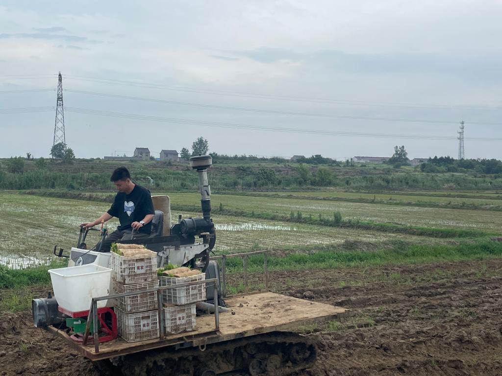 6月15日,在安徽省滁州市天长市汊涧镇张营村,天长市禾禾生态农业专业合作社农机服务人员正在为土地托管户运送秧苗。新华社发