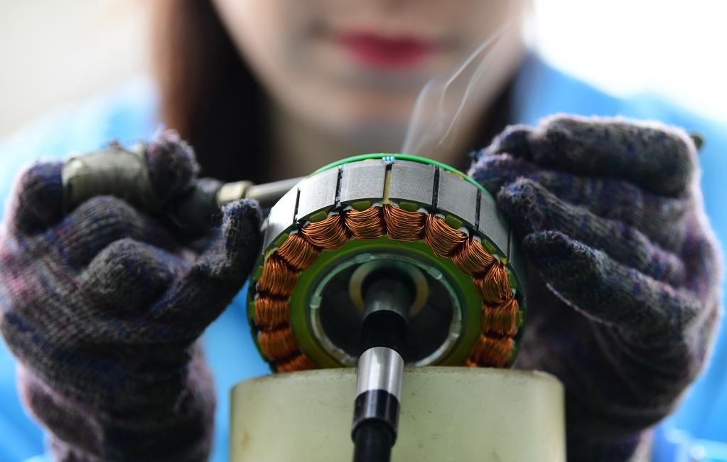 在一家电机制造企业,工人在生产线上工作。新华社发(董军 摄)