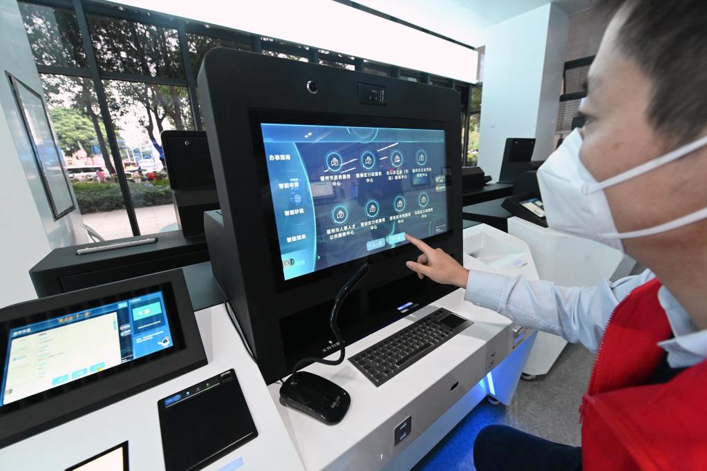 12月1日,志愿者在福州市政务服务中心介绍该市创新推出的首批智能“秒报”事项服务的“榕e办”智能终端的情况。新华社记者 林善传 摄