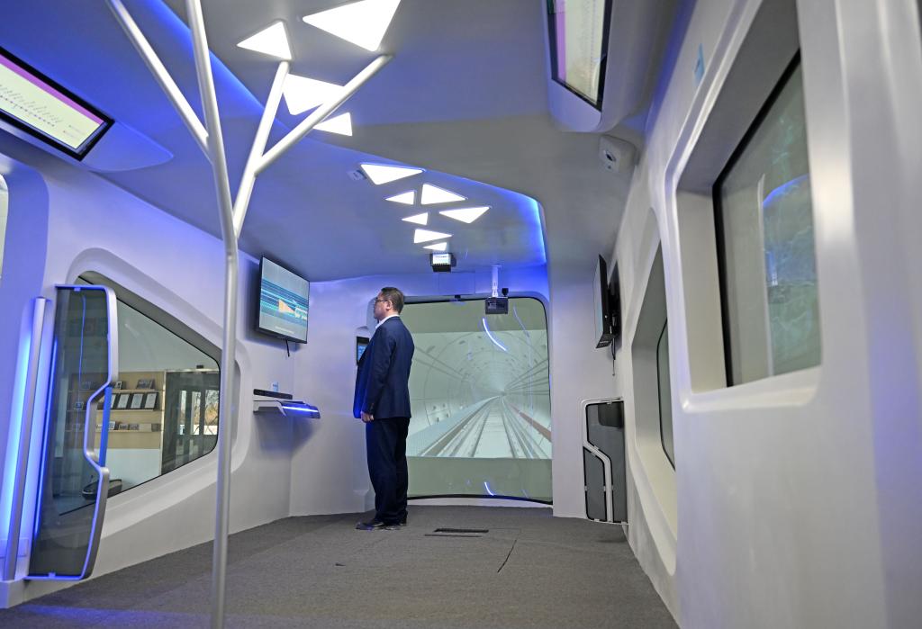 11月15日,在位于天津市武清区的交控技术装备有限公司,工作人员在体验无人驾驶车厢。新华社记者 赵子硕 摄