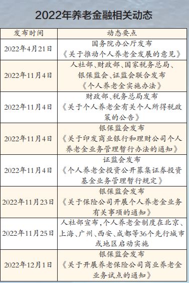 回顾2022年,不少金融行业人士深受鼓舞。这是养老金融政策鼓点尤为密集的一年,特别是2022年4月以来一系列个人养老金制度的出台实施,为商业银行、理财公司、公募基金、保险公司等各类金融机构带来新的发展机遇。2022年12月银保监会发布的《关于开展养老保险公司商业养老金业务试点的通知》,有望进一步丰富商业养老金融供给。