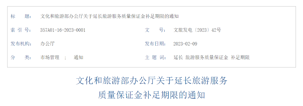 文化和旅游部办公厅日前发布通知延长旅游服务质量保证金补足期限。通知提出,按照《文化和旅游部办公厅关于进一步调整暂退旅游服务质量保证金相关政策的通知》(文旅发电〔2022〕61号)要求享受暂退或暂缓交纳保证金政策的旅行社,补足保证金期限延至2024年3月31日。