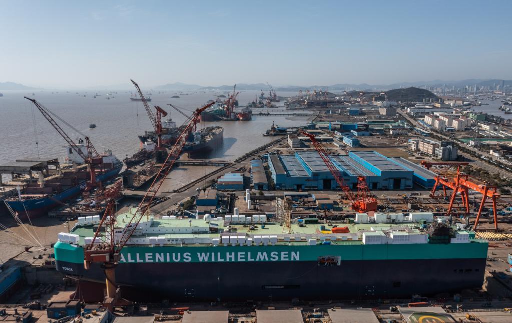 1月31日拍摄的万邦船舶重工(舟山)有限公司的船坞忙碌的景象(无人机照片)。