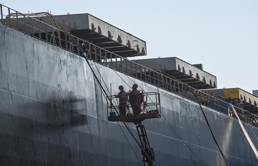 万邦船舶重工(舟山)有限公司的船坞内工作人员正在对一艘外籍货轮进行修理作业。(1月31日摄)。新华社记者徐昱摄