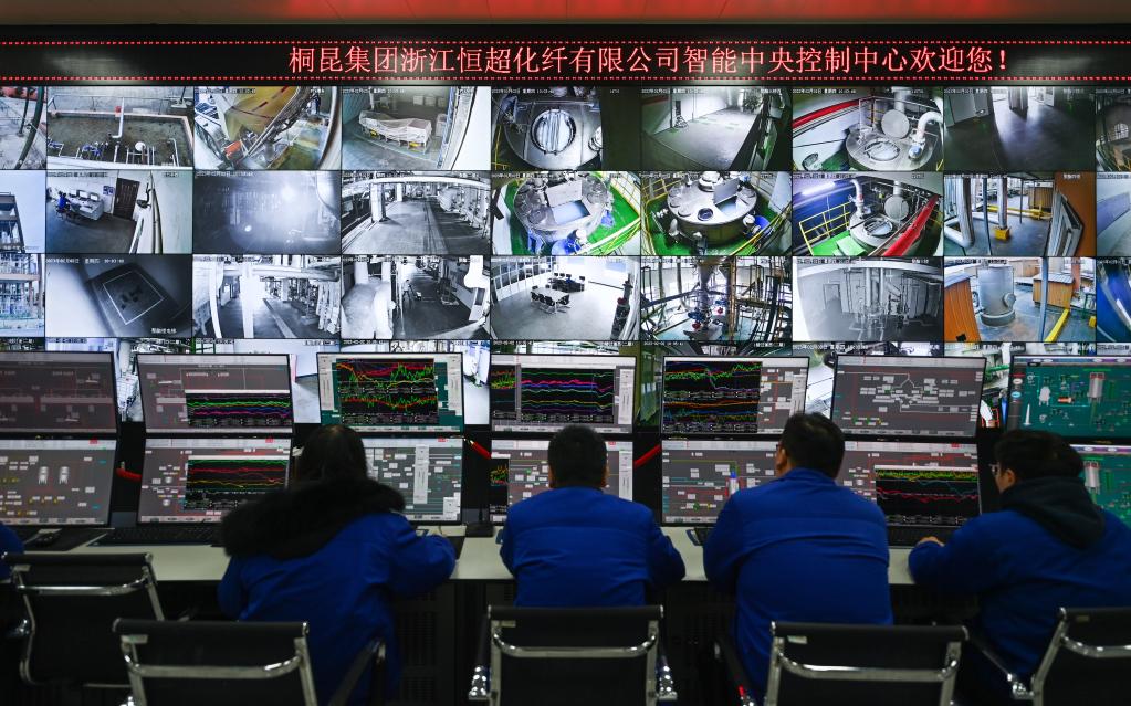 2月2日,位于桐乡市洲泉镇工业园区的桐昆集团浙江恒超化纤有限公司的智控中心内,工作人员正在查看各条生产线的运行情况。新华社记者徐昱摄