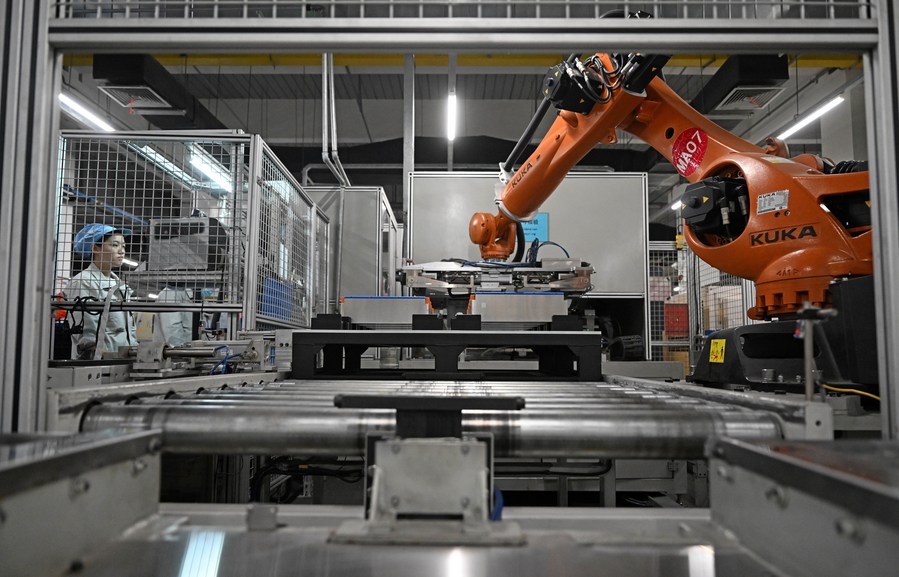 2月8日,在天津力神电池股份有限公司动力电池生产车间,自动化机械设备正在作业。新华社记者 赵子硕 摄