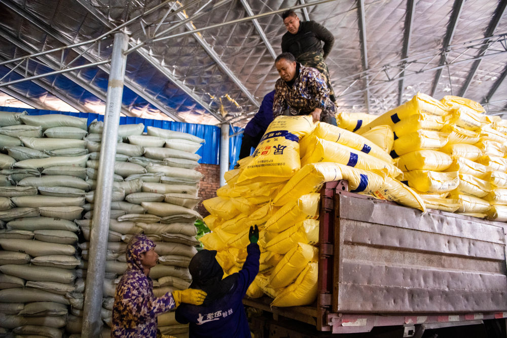 2月3日,工作人员在湖南省永州市祁阳市黎家坪镇供销惠农服务中心化肥储备库卸货。新华社记者 陈思汗 摄