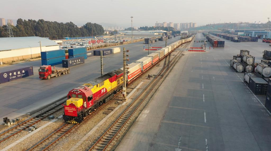 中老铁路国际货物列车从中铁联集昆明中心站驶出。(新华社发)