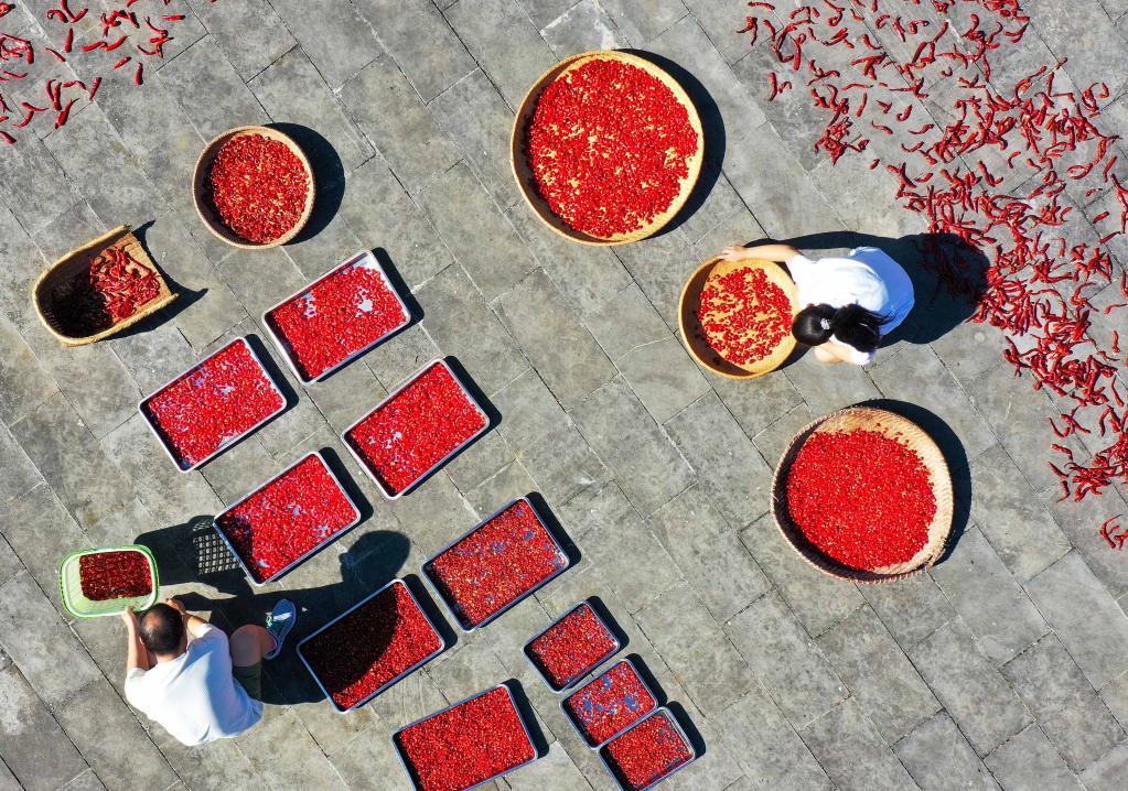 村民在铜仁市玉屏县亚鱼乡亚鱼村晾晒辣椒。新华社发(胡攀学 摄)