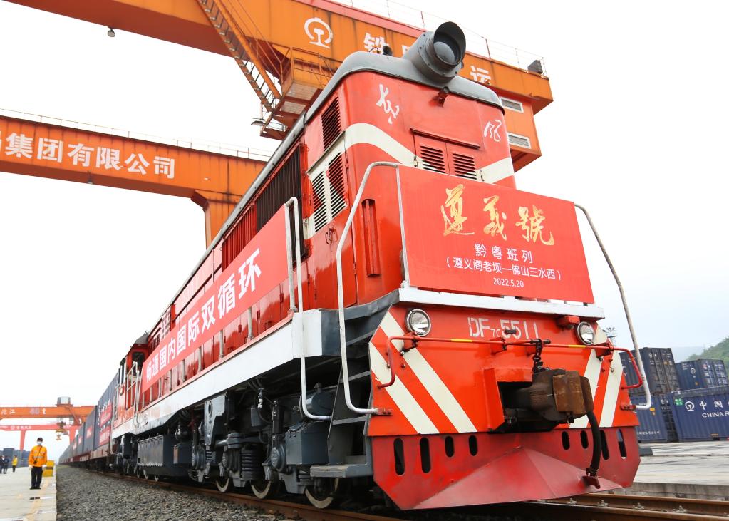 2022年5月20日,黔粤班列“遵义号”在贵州遵义阁老坝站等候发车。新华社记者 刘续 摄