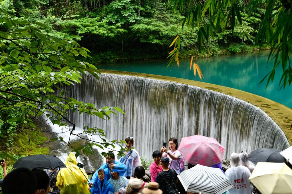 游客在贵州省荔波县小七孔景区游览。新华社记者 杨文斌 摄
