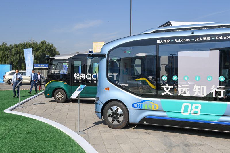 9月21日,在2023世界智能网联汽车大会室外展区,参观者参观展出的无人驾驶小巴车。