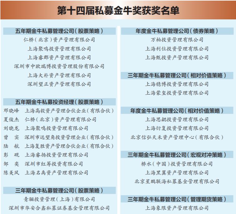 9月27日,由中国证券报主办、国信证券独家冠名的“国信证券杯·第十四届私募金牛奖评选”榜单揭晓,共15个奖项、57个获奖名额出炉。