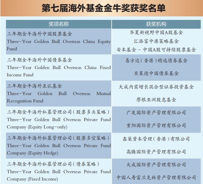 在第七届海外基金金牛奖评选中,华夏新视野中国A股基金、汇添富中港策略基金、安本基金–中国A股可持续股票基金3只海外中国基金荣获“三年期金牛海外中国股票基金”称号;广发国际资产管理有限公司、重阳国际资产管理有限公司2家海外私募荣获“三年期金牛海外私募管理公司(股票多头策略)”称号;上海保银资产管理有限公司的王强荣获“三年期金牛海外私募投资经理(股票多头策略)”称号。