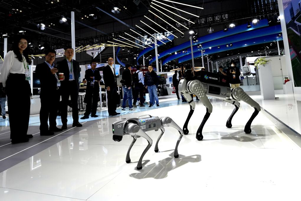 11月7日,在第六届进博会技术装备展区,观众在观看海克斯康展示的智能机器狗。新华社记者 张建松 摄