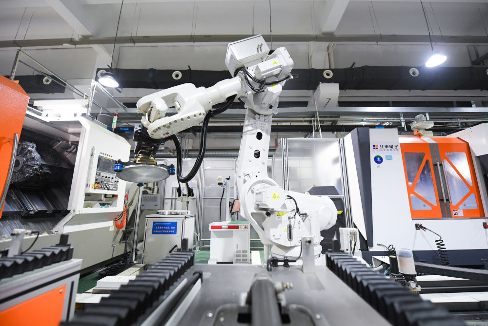 在浙江宁波江丰电子材料股份有限公司分析检测中心,工业机器人在自动化产线加工芯片靶材(2023年3月21日摄)。新华社记者 翁忻旸 摄