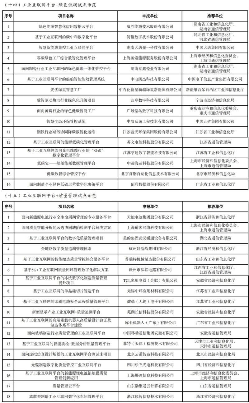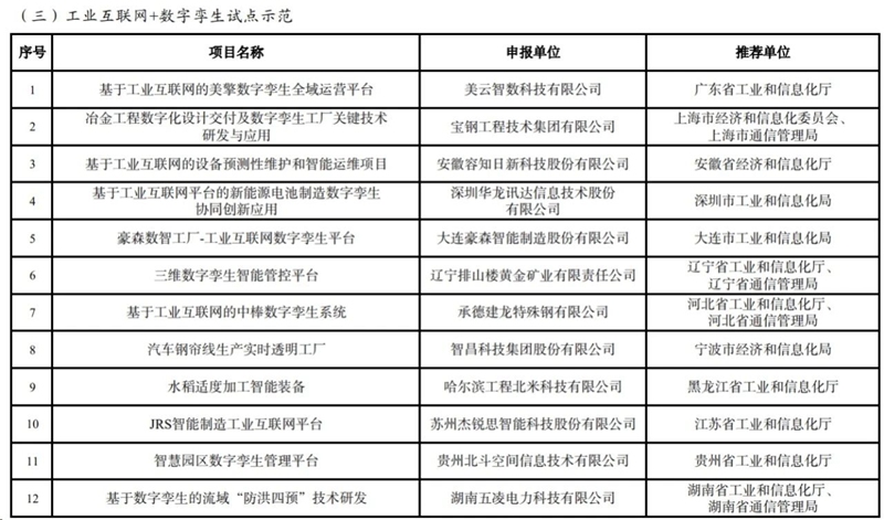 根据《工业和信息化部办公厅关于组织开展2023年工业互联网试点示范项目申报工作的通知》(工信厅信管函〔2023〕319号)要求,经企业自主申报、地方推荐、专家评审和网上公示,确定了 2023 年工业互联网试点示范项目名单,现予以公布。