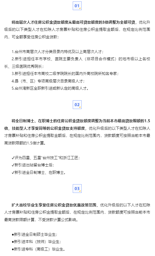 扩大台州市住房公积金人才贷款优惠政策适用范围。将技能型人才列入台州市住房公积金人才优惠政策适用范围,扩大高校毕业生享受住房公积金贷款优惠政策范围。