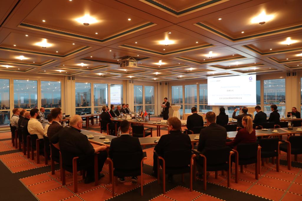 1月22日,中国江苏省太仓市在德国北威州贝库姆市为落户的第500家德企伯曼集团举行授牌仪式。新华社记者 杜哲宇 摄