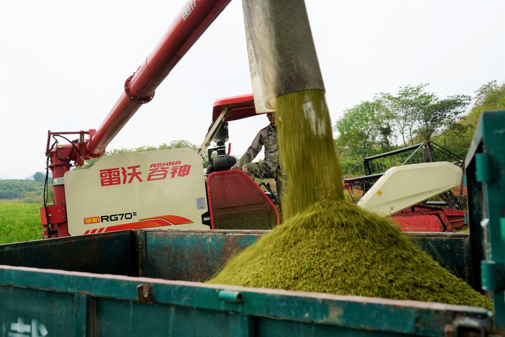 农机手在湖南省靖州苗族侗族自治县甘棠镇溪口村将收割的制种水稻装车。新华社记者 余春生 摄