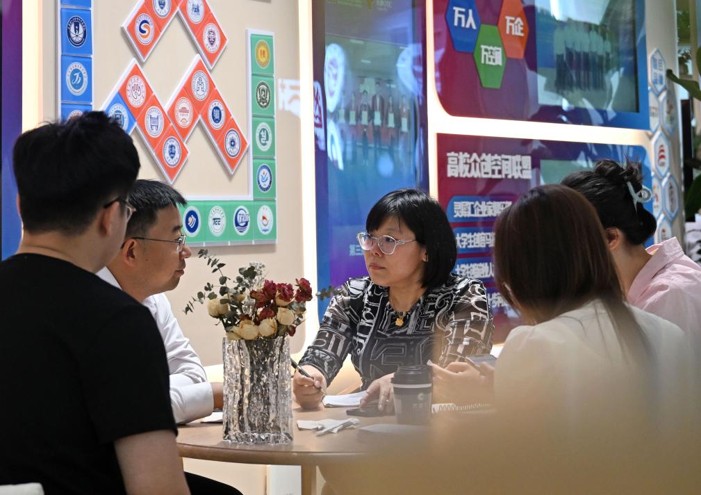 创业者在天开高教科创园天开广场的一家众创空间内讨论(5月14日摄)。新华社记者 赵子硕 摄