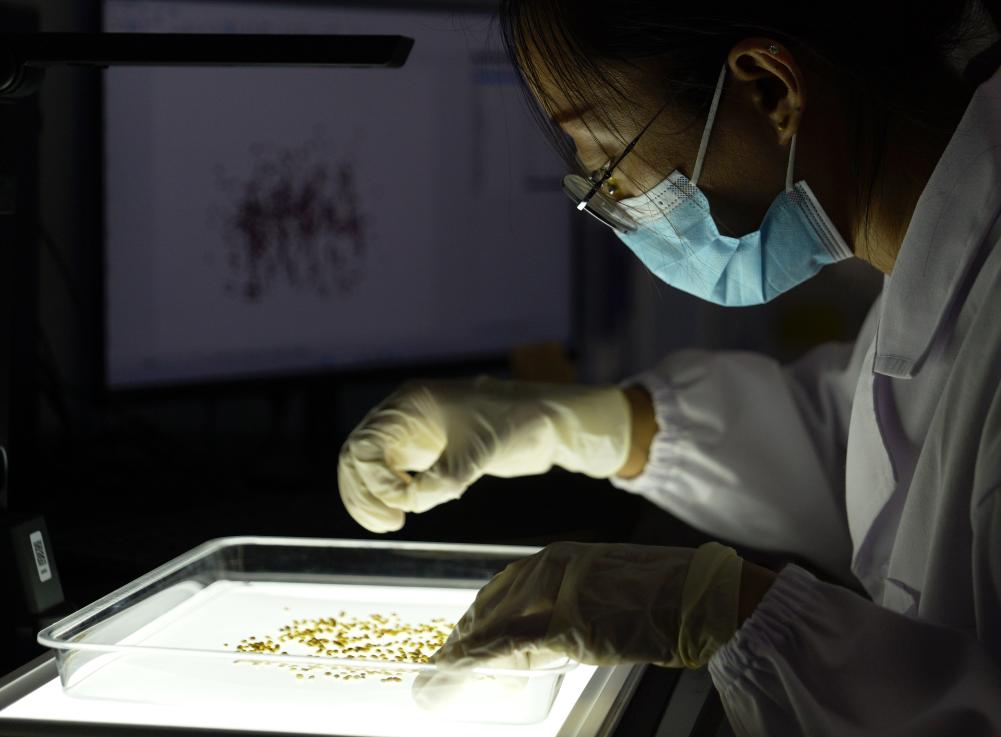 5月16日,中国农科院中原研究中心科研人员在中原农谷实验室内进行高粱样品筛选。新华社记者 李嘉南 摄