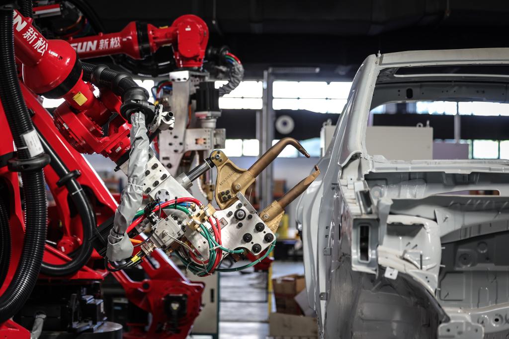 2024年5月9日,在广西柳州市上汽通用五菱精益智造工厂,机器人为汽车装配挡风玻璃。新华社记者 金皓原 摄