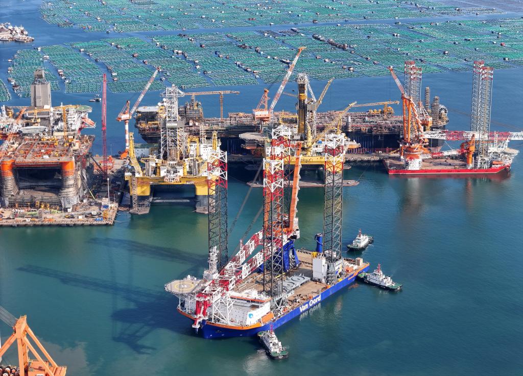 在中集来福士山东烟台建造基地,多型海工装备和特种船舶在进行建造和测试(10月16日摄,无人机照片)。新华社发(唐克摄)