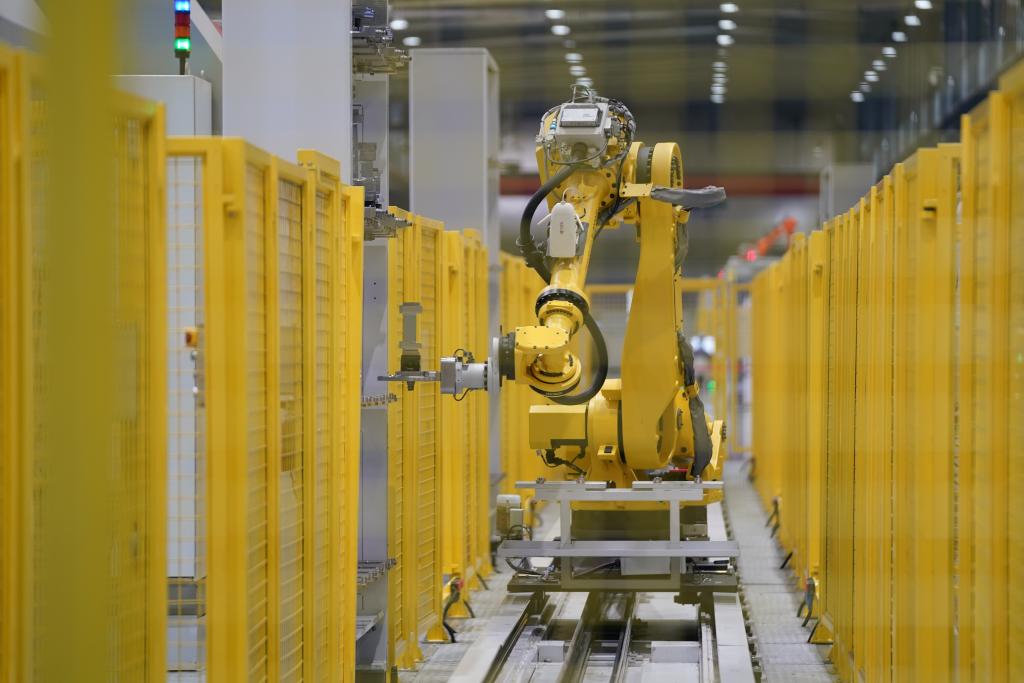 在东方汽轮机有限公司的叶片加工无人车间,机械臂抓取处理好的叶片部件(10月21日摄)。新华社记者 胥冰洁 摄