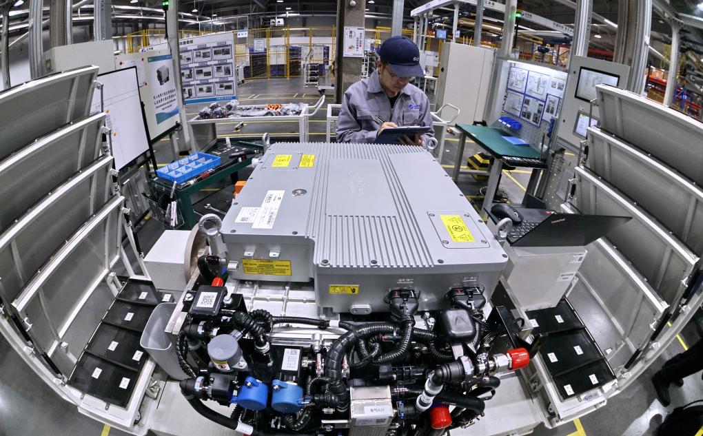 在北京大兴国际氢能示范区内,一家生产氢能燃料电池发动机企业的员工在装配设备(10月13日摄)。新华社记者 李欣 摄
