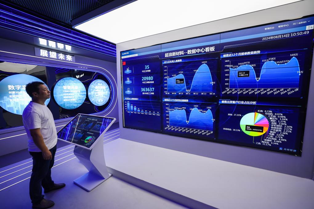 8月14日,在金华市金东区江东镇的浙江超浪新材料有限公司内,数据中心看板实时显示企业流水线的各项生产数据。新华社记者 徐昱 摄