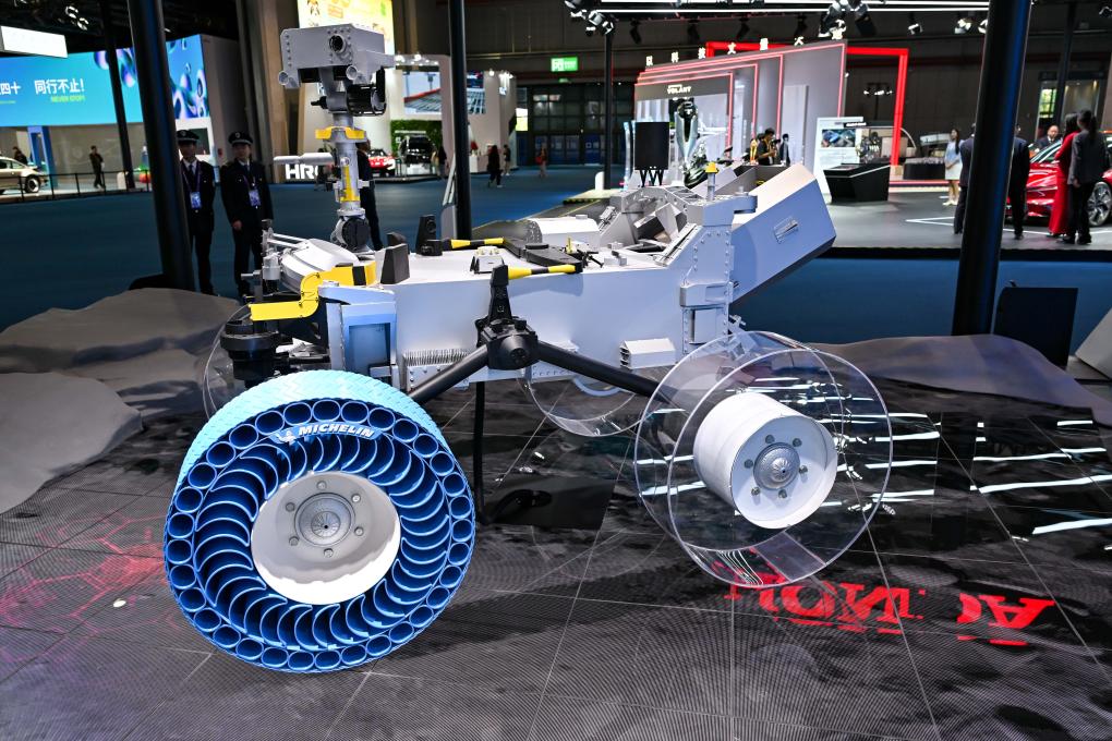 11月5日在第七届进博会汽车展区拍摄的米其林月球探测车轮胎。新华社记者 张铖 摄