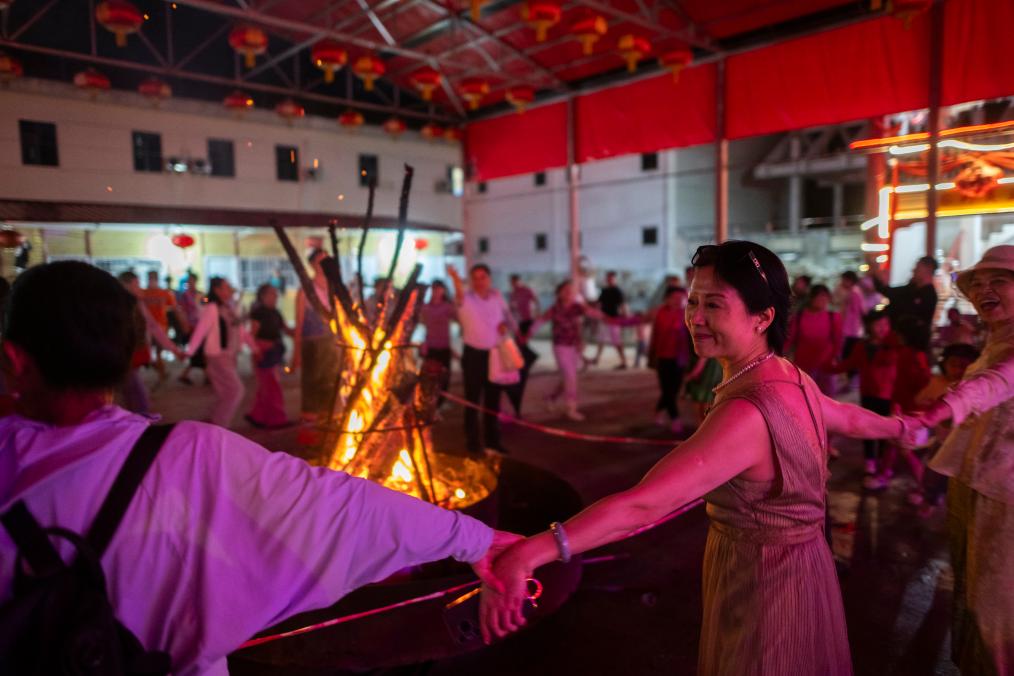 8月6日,在神农架林区木鱼镇,游客在篝火晚会上跳摆手舞。(新华社记者 伍志尊 摄)