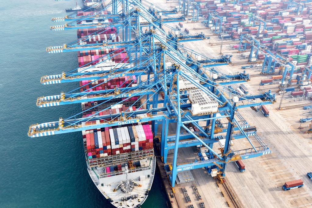 2024年2月10日,在山东港口青岛港全自动化码头,货轮在装卸外贸集装箱。新华社发(俞方平摄)