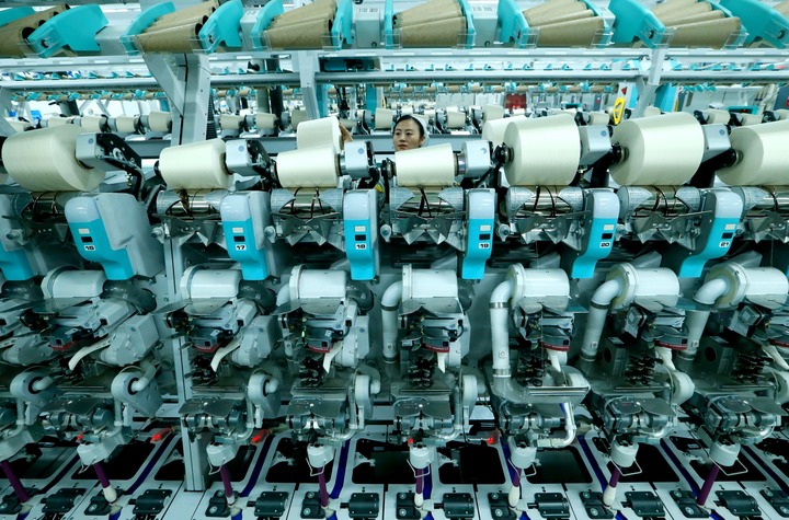 2024年11月27日,在位于青岛市即墨区龙山街道的青岛即发纺织科技有限公司智慧纺纱生产线上,工人在生产高端纤维。新华社发(梁孝鹏摄)