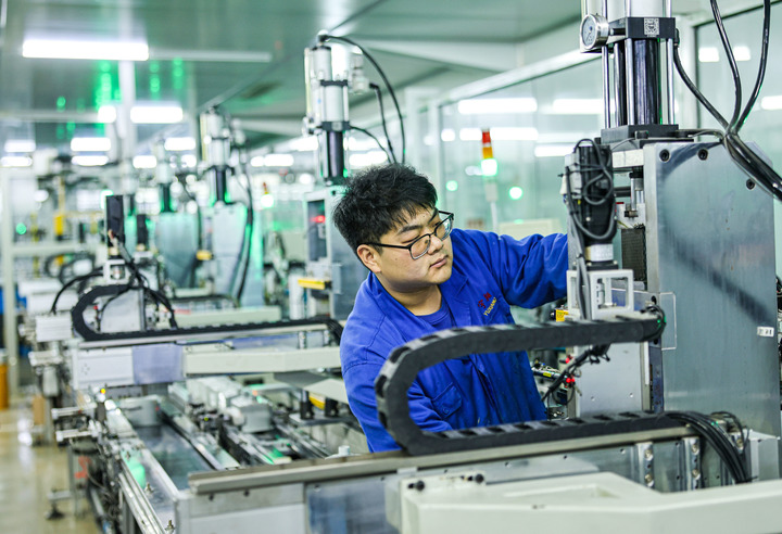 2024年12月12日,在山东省荣成市一家燃气计量仪表制造企业的智能化生产车间内,维修工人在进行设备调试。新华社发(李信君摄)