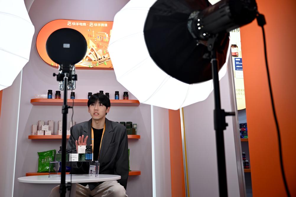 2024年11月5日,快手跨境主播在第七届进博会服务贸易展区直播。新华社发(陈浩明摄)