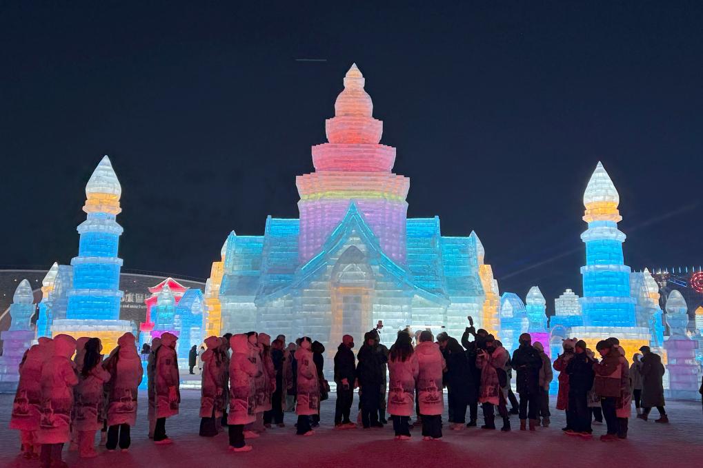 2024年12月26日,游客在哈尔滨冰雪大世界园区内拍照游玩。新华社记者杨思琪 摄