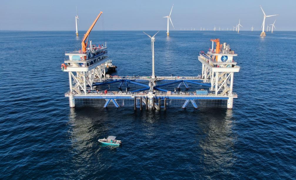 这是2024年9月2日拍摄的中广核“伏羲一号”风渔融合网箱平台(无人机照片)。9月4日,超大型风渔融合网箱平台——中广核“伏羲一号”正式在广东汕尾建成投运。新华社记者邓华 摄