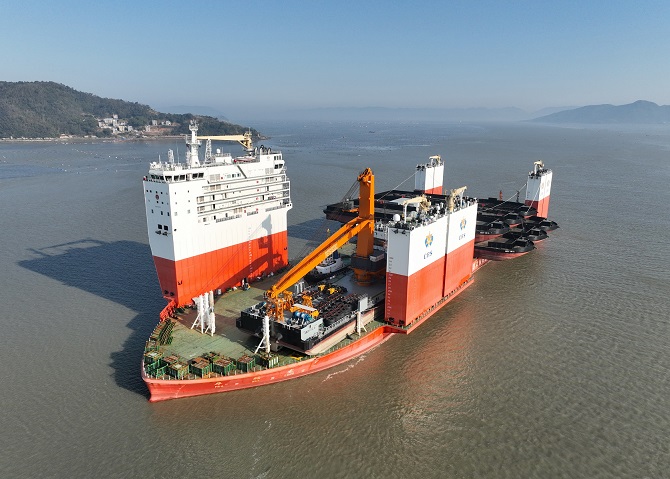 图为装载13艘船舶的“华瑞龙”半潜船在宁德灶屿水域等待启航(2月28日摄,无人机照片)。