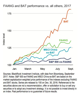图中显示,中国的BAT(百度,阿里以及腾讯)今年以来的股价走势(橘红色),远超美国科技股的领头羊FAANG(Facebook, 亚马逊,苹果, Netflix以及Google) 的绿色线。而刨除BAT的中国概念股的走势,也远超美国标准普尔走势。
