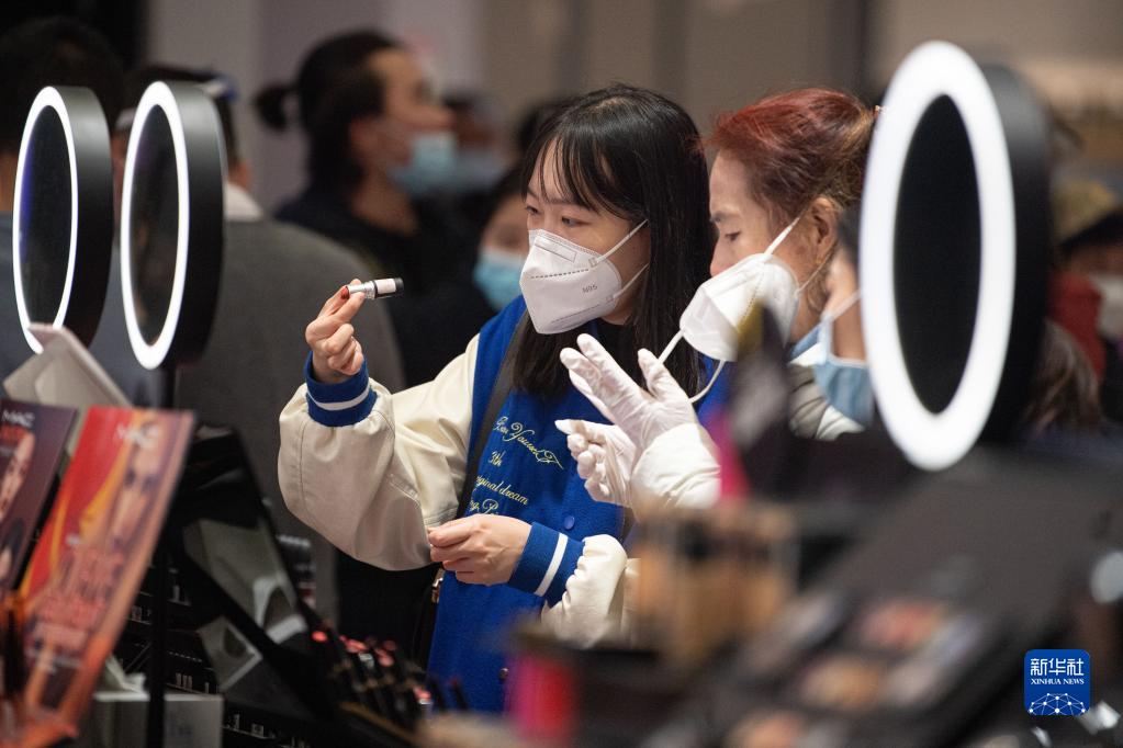 1月29日,消费者在中免集团海口日月广场免税店选购化妆品。 新华社记者 蒲晓旭 摄