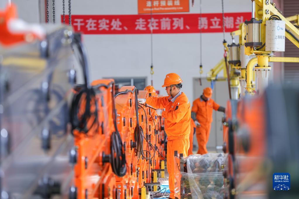 1月29日,在浙江省湖州市德清县雷甸镇浙江鼎力机械股份有限公司大型高空作业机械未来工厂,工人加紧赶制出口的新臂式智能高空作业平台设备。 新华社发(蔡俊 摄)