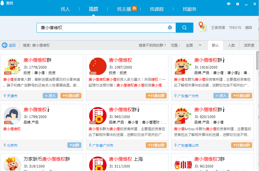 比如,在QQ上搜索唐小僧维权,便可搜出众多群组织: